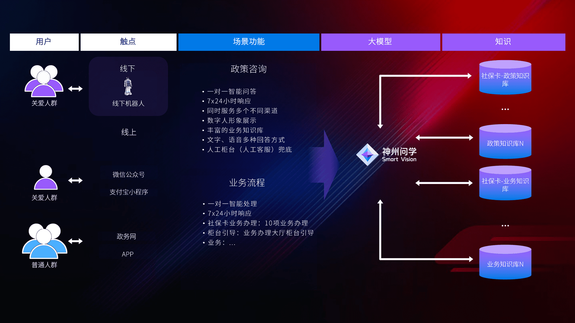 • 线上线下全覆盖:线上提供微信公众号、、、支付宝小程序、、、、政务网、、、app多种渠道,,与线下机器人形成完整服务体系。。。