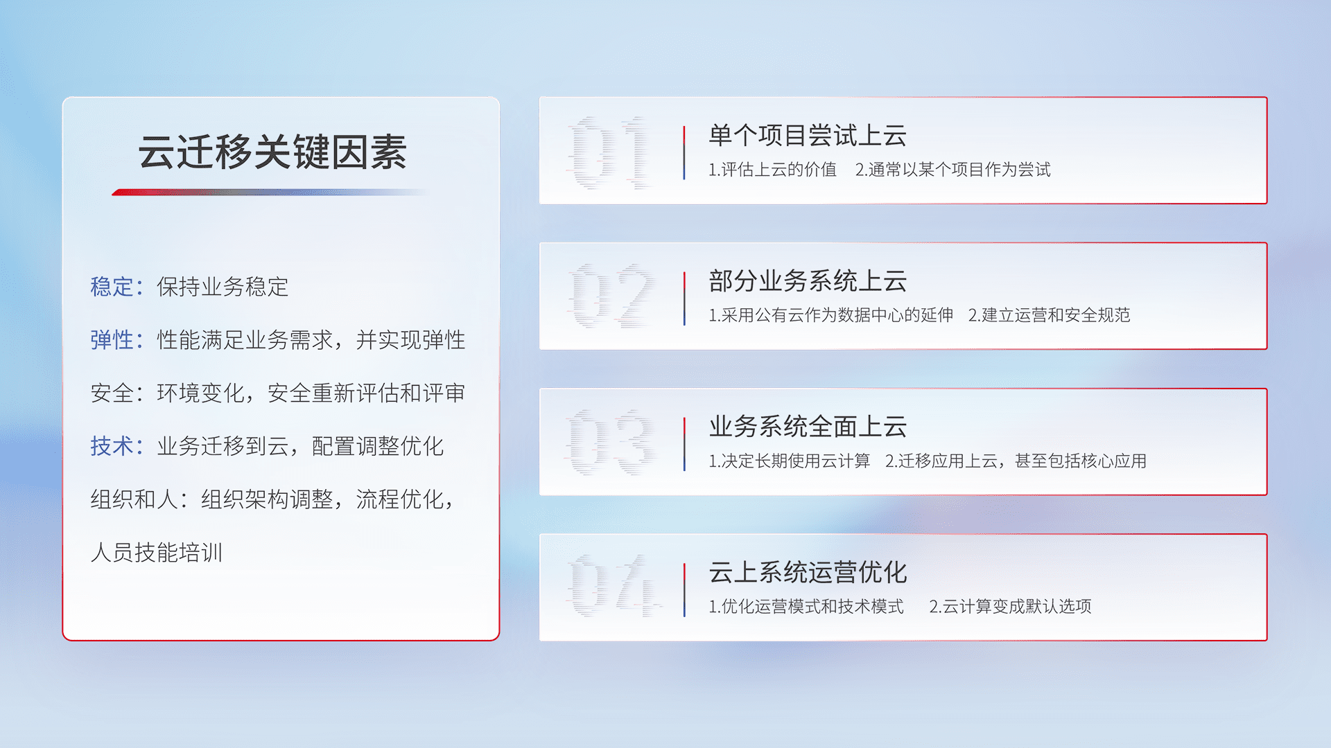 结合实际业务,,,,从规划设计、、、云平台选型、、、云原生改造、、数据迁移、、、、集成交付,,,,迁移全过程为客户识别最佳上云路径,,做好风险识别管理,,,设计网络架构、、、、身份权限、、、、安全审计合规、、、操作审计、、、日志审计、、、监控告警策略、、多站点容灾设计等,,对云上基础设施进行整体规划,,,提升IT治理水平,,,,以满足弹性、、高可用、、、、高性能的需求。。