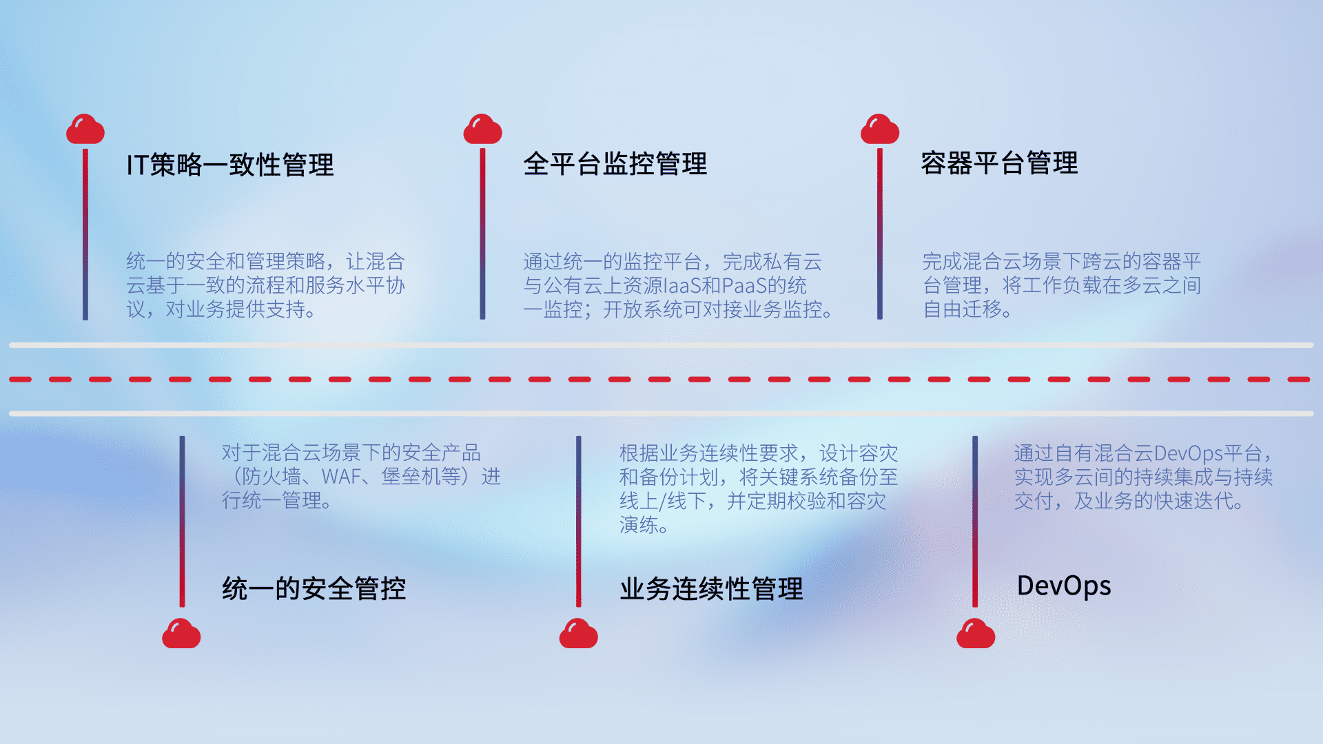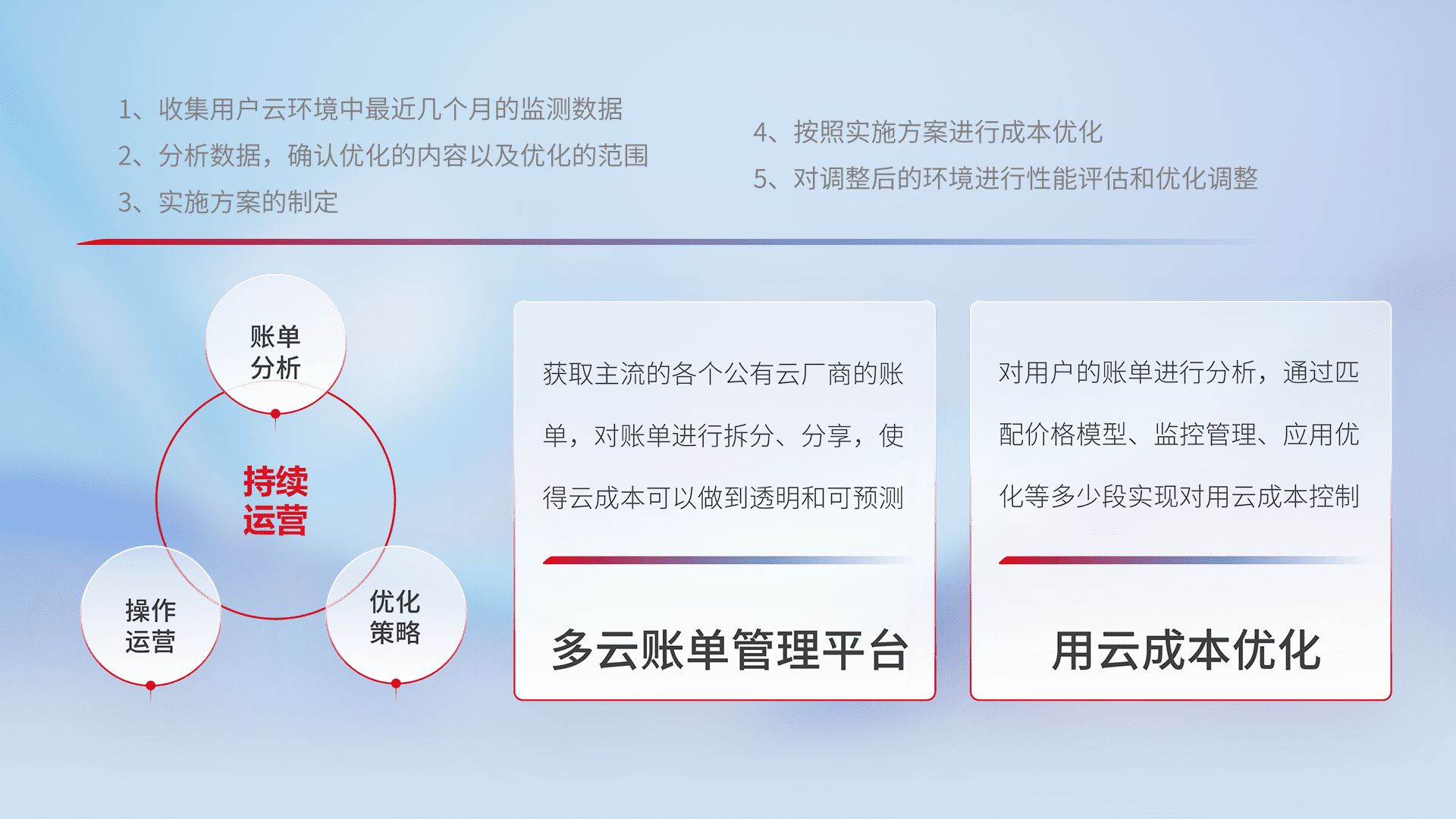 通过多云纳管,,,以统一的资源数据模型把客户的云资源进行抽象和封装,,,进而实现对多云资源的统一操作,,保障云资源管理的可靠性、、、稳定性与可用性。。。。量身定制化运维内容,,,,配置、、、、开发运维、、、、补丁管理、、备份、、、监控、、、、认证和访问管理、、审计和日常巡检等,,保障在用云过程中的可靠度,,,,稳定度以及高可用率。。
